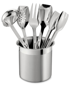 The All-Clad 6 Piece Stainless Steel Cook & Serve Set includes a solid spoon, slotted spoon, ladle, fork, tongs, and caddy. These high-quality tools are perfectly designed and sized for both cooking and serving.