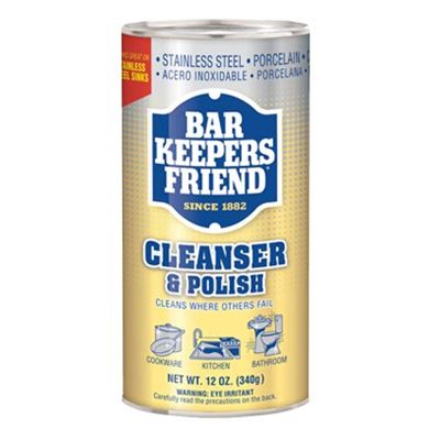 Bar Keepers Friend Cleanser and Polisher The original 1882 formula powdered cleanser still delivers premium cleaning power for any stain on any non-porous surface. As a bleach-free product, Cleanser & Polish is an ideal stainless steel cleaner and can easily remove rust, tarnish, mineral deposits, and tough stains.