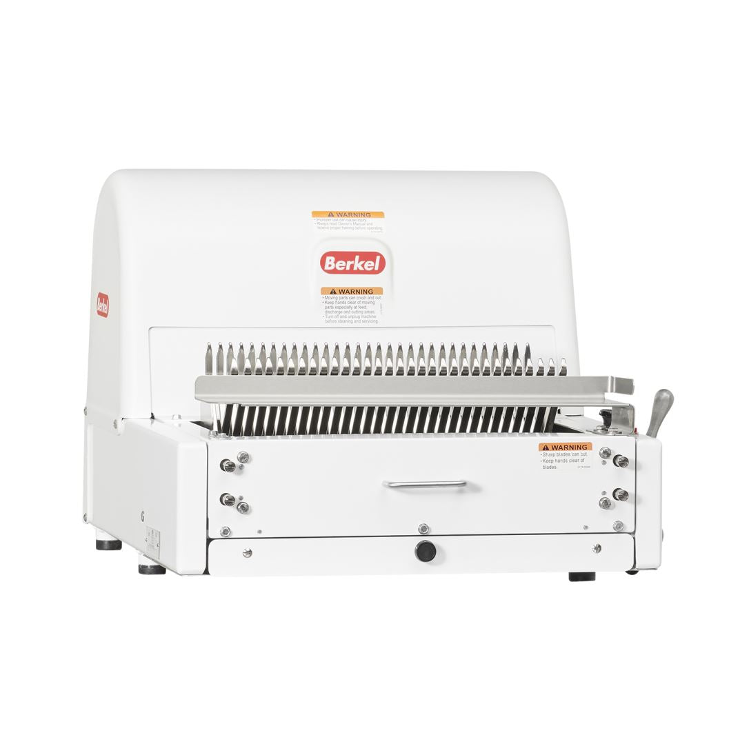 Berkel Model MB3/8STD bread machine slices soft and hard crusted loaves with consistent precision and handles loaves up to 15.5". Its compact design saves on counter space and is simple to operate. Simply place a loaf in the MB and lift the operator lever. The motor starts and the blades begin to move back and forth, cutting gently and cleanly from the top. The unit features a convenient front-mounted stainless steel bagging trough and easy access, removable scrap pan. The independently mounted blades are a special heat-treated, alloy carbon steel and are easily replaceable. The MB features a Sky White, polyester powder coat finish and all product contact areas are stainless steel for easy cleaning.
