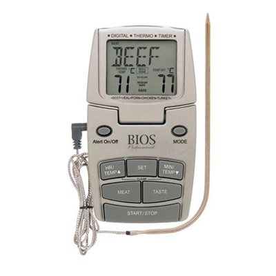 Cook meat and poultry to perfection with the Bios Pre-Programmed Meat & Poultry Thermometer Timer. This user-friendly device ensures precise cooking with pre-set temperatures, ideal for home or professional kitchens.