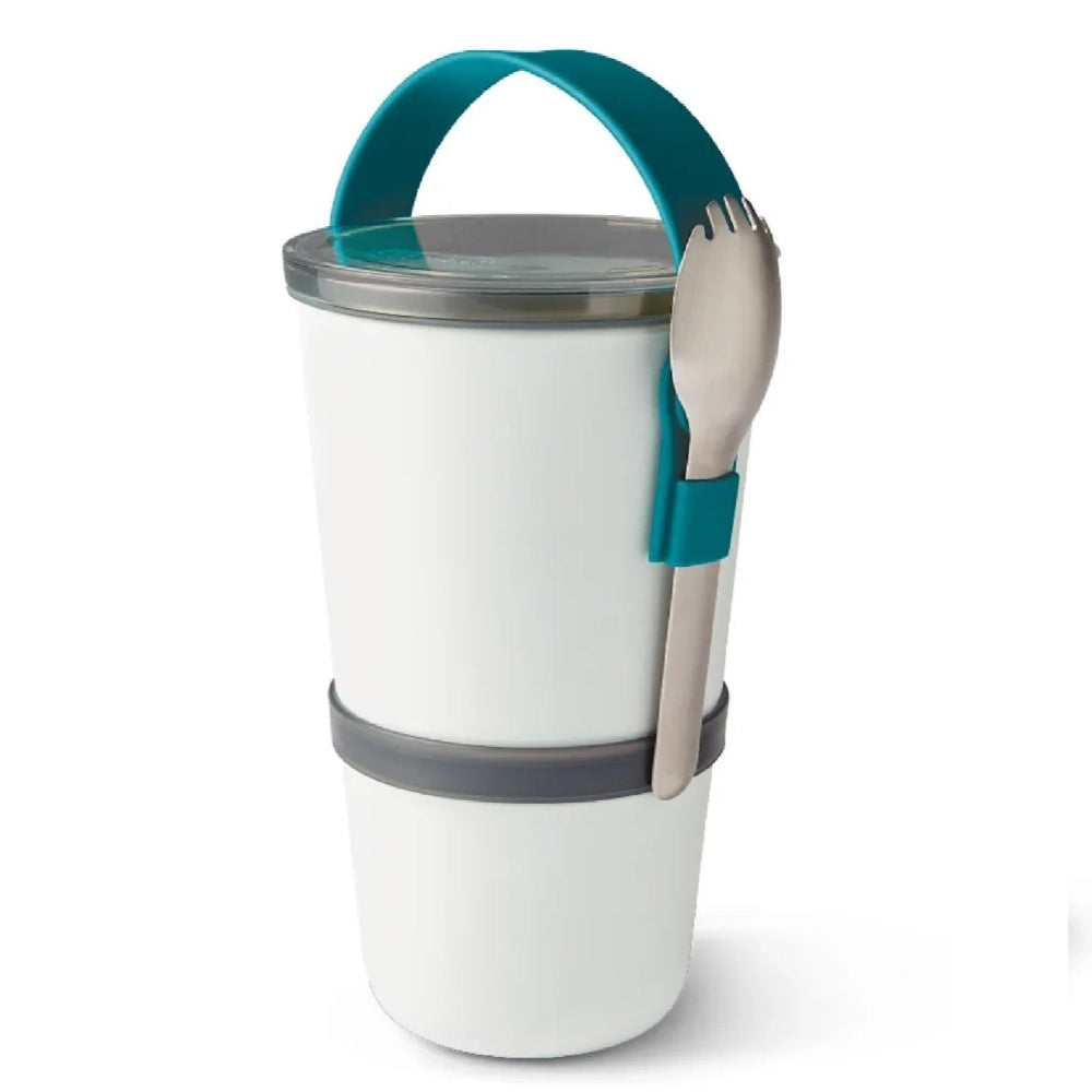 The Lunch Pot is inspired by Indian tiffin carriers, and is a slimmer and taller design that is compact and easy to carry. It consists of two water-tight pots that can be locked together. It also features a convenient silicone strap and a stainless steel "spork" (a combination spoon and fork). The two pots allow you to separate items like yogurt and fruit or noodles and soup. When empty, the smaller pot fits inside the larger one for easy storage.