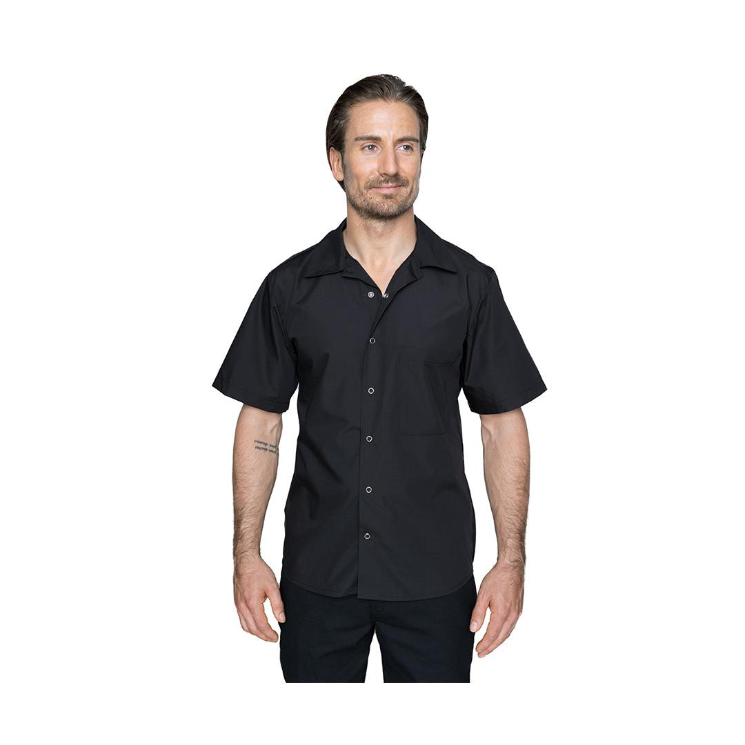 - Classic black cook shirt with snap-button front.