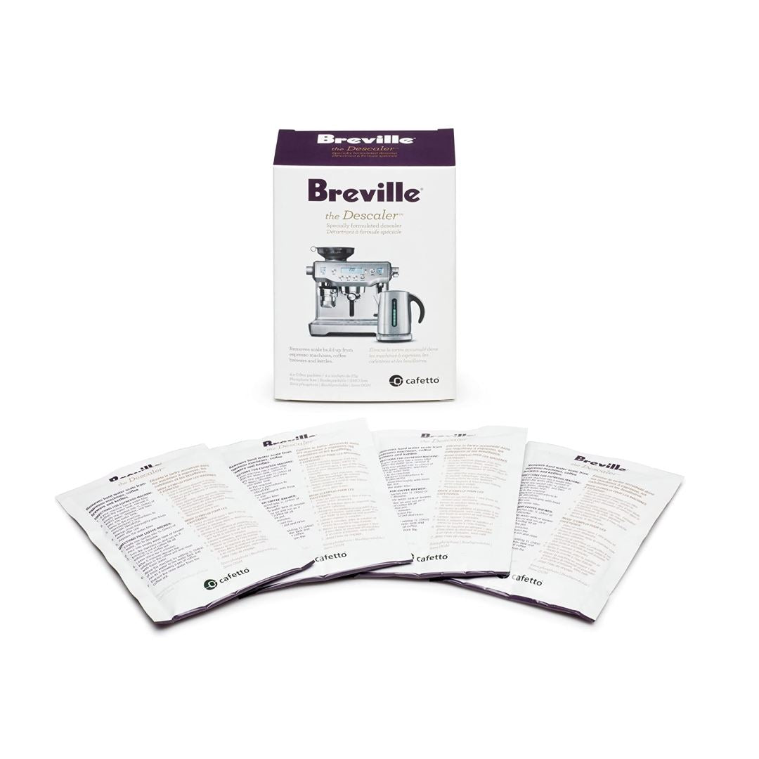 Breville's specially formulated descaler removes scale build-up from espresso machines, coffee brewers, ta makers, and kettles. Pack includes 4 packets (4 uses). Phosphate-free, biodegradable, and GMO-free. Can be used with all Breville espresso machines, coffee machines, kettles, and tea makers.