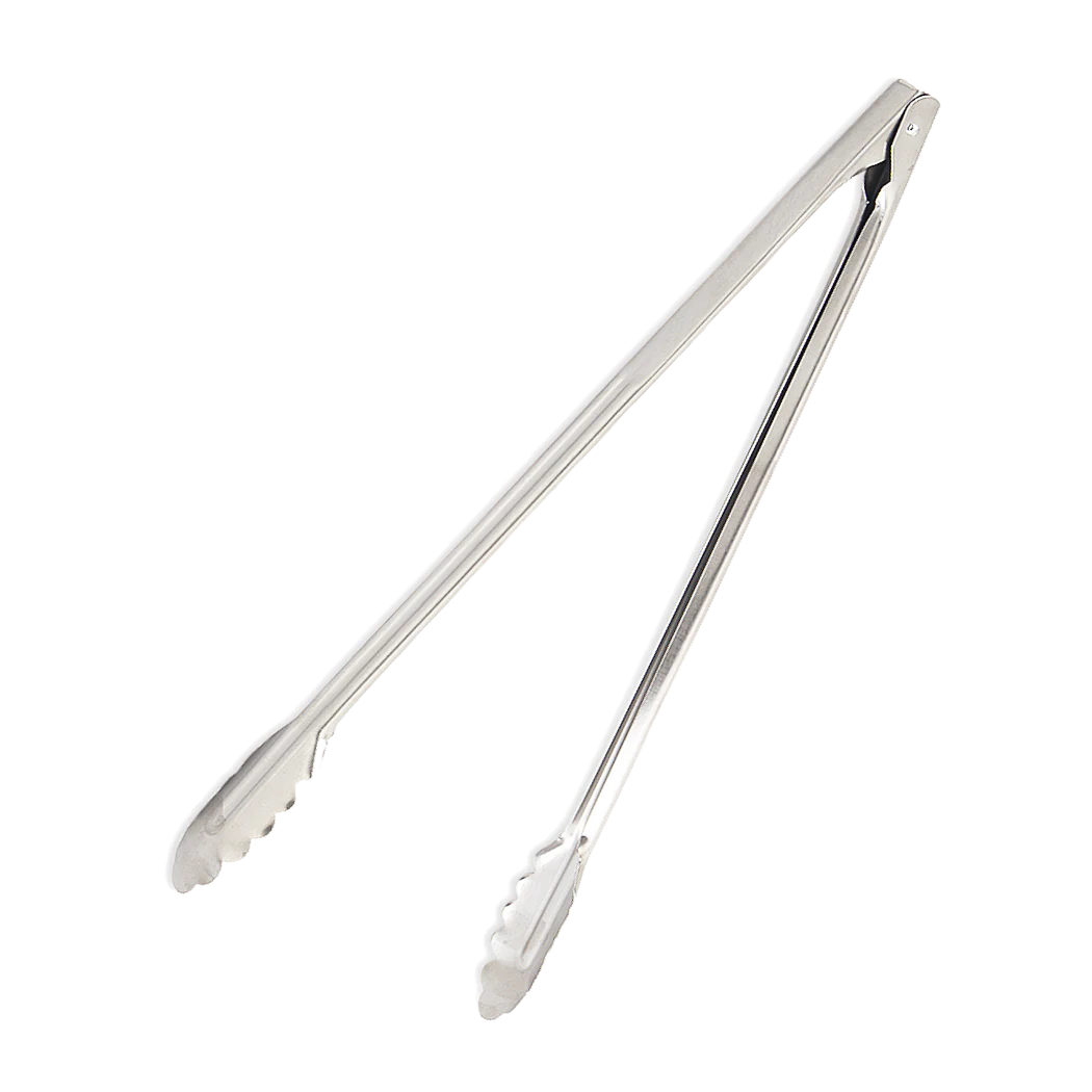 The Browne 16" Utility Tongs, Stainless Steel are designed for versatility and durability in the kitchen. Made from high-quality stainless steel, these tongs feature coil spring operation for smooth and reliable use. The scalloped edges provide a secure grip, making them ideal for handling a wide variety of foods.