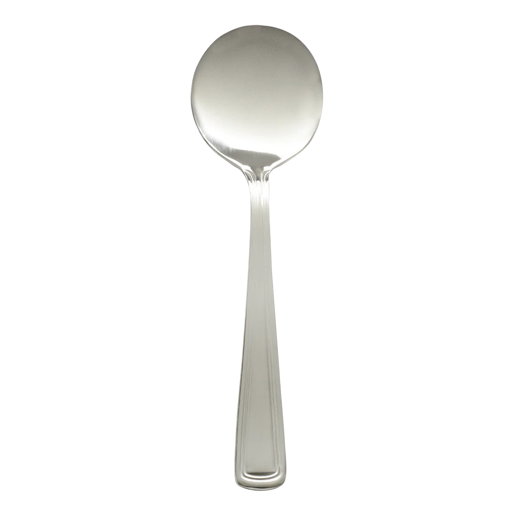 The Browne 50 2613 Royal Soup Spoon features a classic design with a simple double ridge pattern on the handle, expertly crafted from durable 18/0 stainless steel. Its elegant mirror finish adds a touch of sophistication to any table setting, making it perfect for both everyday use and special occasions.