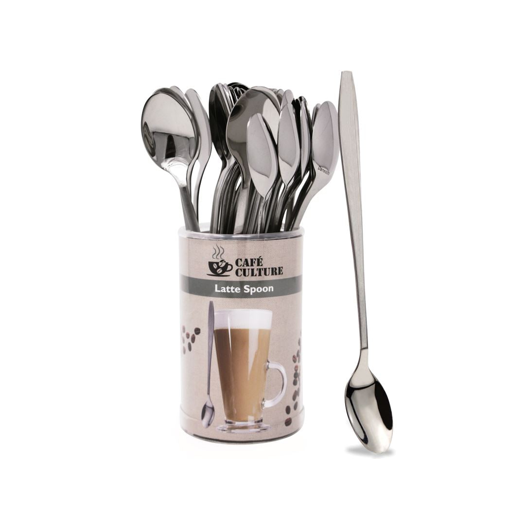 The Café Culture Latte Spoon, crafted from polished stainless steel. This elegant spoon is ideal for stirring lattes or other tall coffee drinks, adding sophistication to your coffee routine.