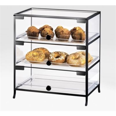 - This Display case features a clear acrylic look with a black iron accent. It's front triple doors will go great in any bakery, coffee shop, breakfast setting or market, making it simple and easy to create a self-service area.