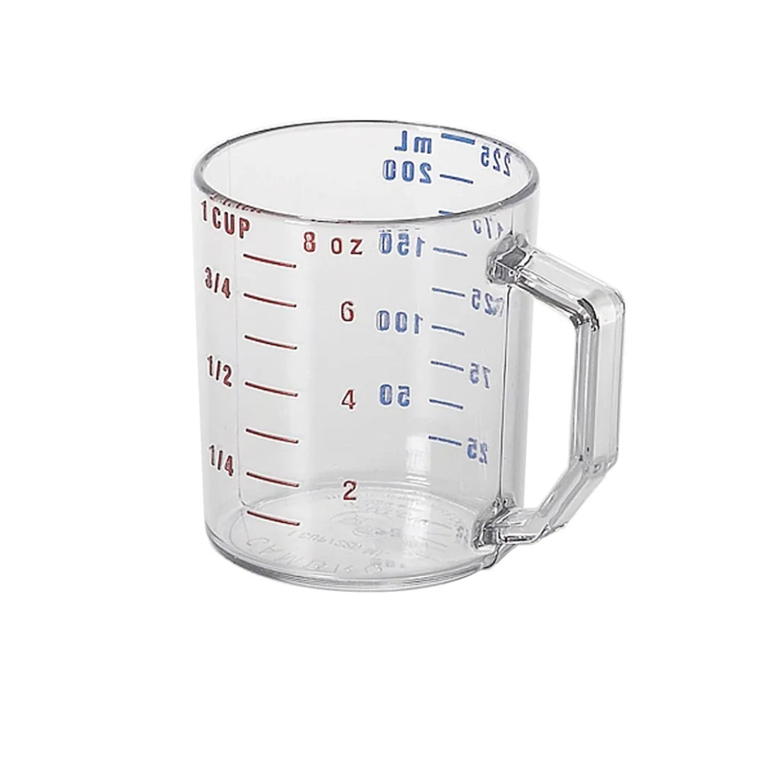 Introduce a new level of accuracy and efficiency to your kitchen with the virtually unbreakable Cambro 25MCCW135 Camwear 1 Cup Clear Measuring Cup! This crystal-clear design is marked with blue metric and red American standard graduations, saving time and ingredients in the fastest paced environments. Molded in handles are as durable as the cup, ensuring safe carrying.