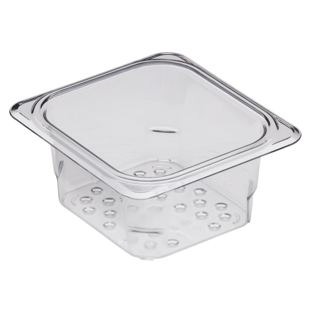 Rinse, drain, and store your meats and produce all-in-one with the Cambro 63CLRCW135 Camwear 1/6 Size Colander Pan, reducing food waste and cross-contamination! This virtually unbreakable, crystal-clear solution is ideal for storing prepped produce, defrosting meat, and storing seafood on ice. Liquids drain into the Camwear pan below, reducing spoilage from product sitting in drippings.