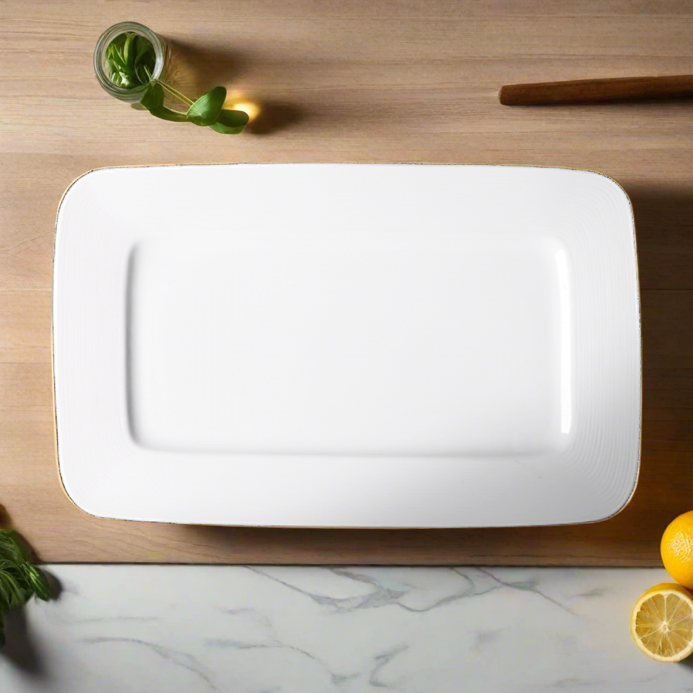 Cameo China’s Royalmont Platter offers a timeless serving solution that blends classic elegance with everyday practicality. Its clean oval design and bright white glaze make it ideal for presenting entrées, shared plates, or buffet offerings.