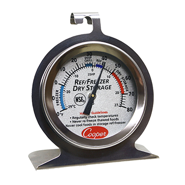 Introducing the Cooper-Atkins Refrigerator/Freezer/Dry Storage Thermometer, the perfect tool for monitoring temperatures in your commercial kitchen. This thermometer features a colored 2" (5cm) dia. dial that is zoned with specific applications and HACCP guidelines, making it easy to quickly and accurately read temperature levels. With a temperature range of -20 to 80°F (-29 to 27°C) and a ±2°F (±1°C) temperature accuracy, you can rely on this thermometer to provide accurate temperature readings.The Cooper-Atkins Refrigerator/Freezer/Dry Storage Thermometer is made of durable stainless steel, making it resistant to corrosion and ensuring long-lasting performance. The thermometer can be easily hung or stood on a flat surface, allowing for flexible placement and easy visibility.This thermometer is NSF certified, ensuring that it meets the highest standards of quality and safety. It is perfect for use in refrigerators, freezers, and dry storage areas, making it a versatile and essential tool for any commercial kitchen.Invest in the Cooper-Atkins Refrigerator/Freezer/Dry Storage Thermometer today and experience the ultimate in temperature monitoring convenience and reliability. With its clear, color-coded dial and durable stainless steel construction, this thermometer is a must-have for any commercial kitchen. So, order now and take the first step in ensuring the safety and quality of your food.