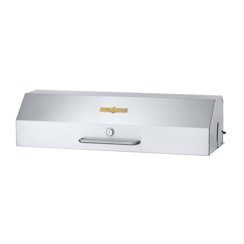 The Crown Verity CV-RD-48 roll dome cover features durable, all stainless steel construction, a handle, and built-in thermometer, and is designed to fit 48" Crown Verity outdoor charbroiler grills.
