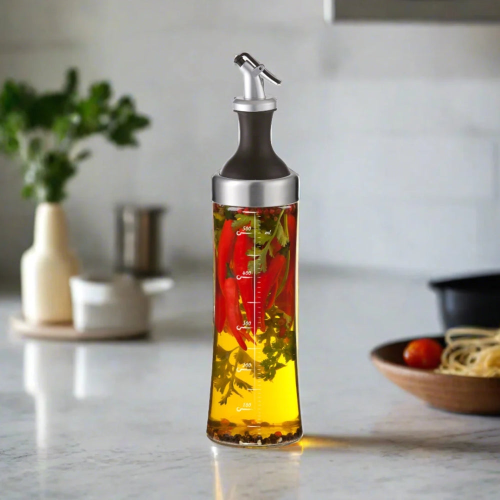 Cuisinox Herb Infusion Bottle, a stylish glass bottle for creating flavorful infused oils. Perfect for adding bold tastes to dishes, this infuser bottle enhances your cooking with ease and elegance.