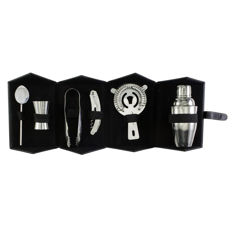 The Danesco Bar Accessory Set, designed for durability and style. This comprehensive set equips your home bar with essential tools, neatly organized in a fold-out case, perfect for mixologists of all levels.