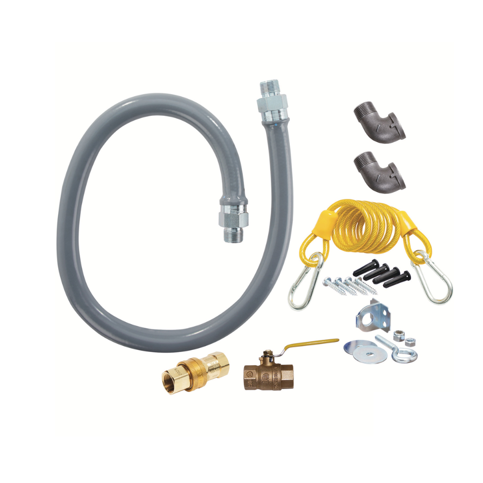 Complete Kit Components: Each kit includes the ReliaGuard gas hose, Standard Snap™ quick-disconnect, full port brass ball valve, restraining device with PVC-coated steel cable and mounting hardware, and 90-degree malleable iron street elbows.