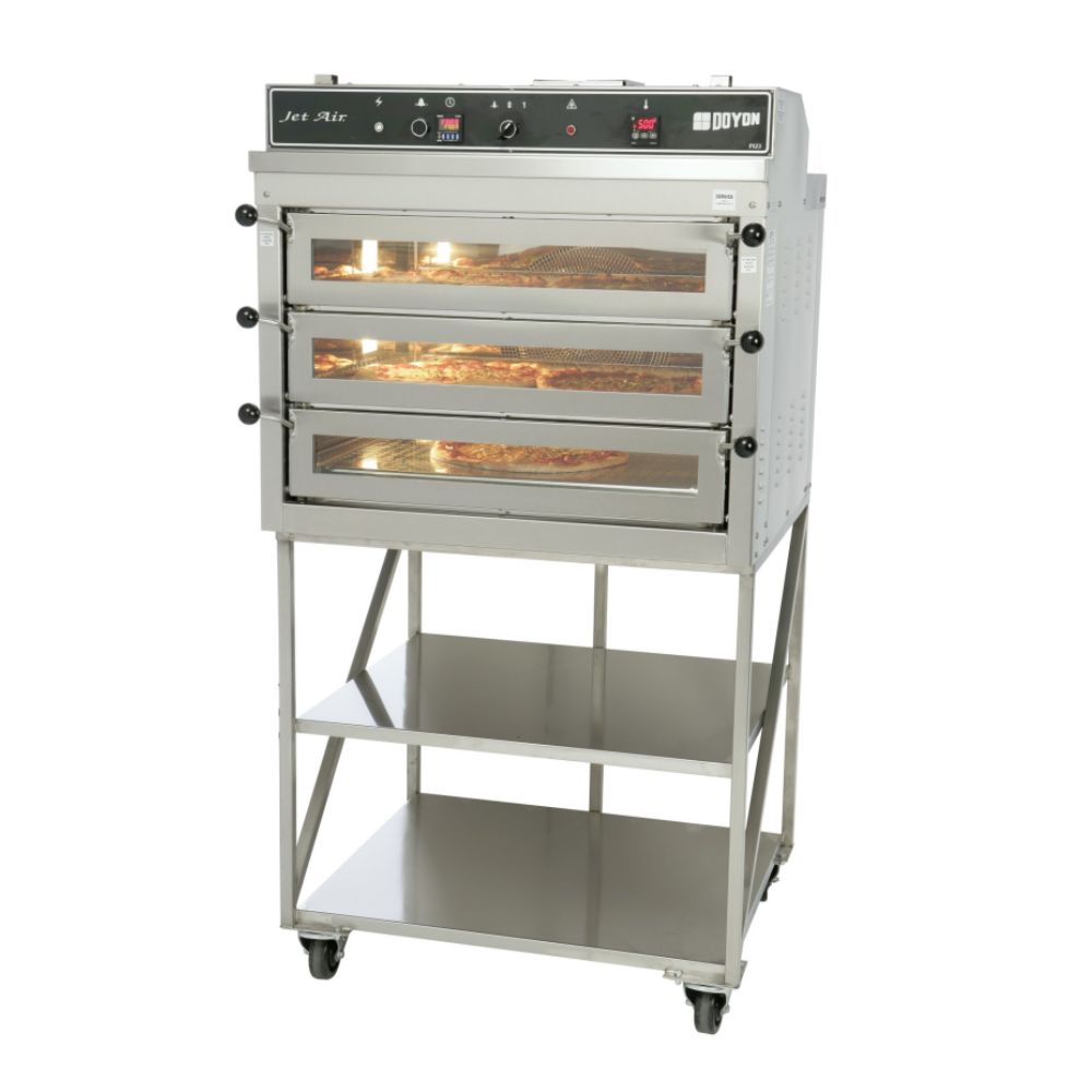 The Doyon Jet Air 36" Triple Deck Pizza Oven, Electric is a high-performance, space-saving pizza oven designed with exclusive JetAir baking technology, ensuring even heat distribution for perfect baking results. Featuring a reversing fan system, fast preheat time, and three perforated nickel-plated decks, this oven delivers exceptional crust quality and efficiency.