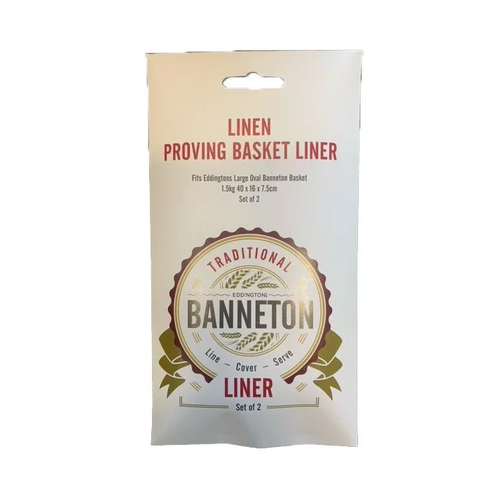 Eddingtons Large Proving Basket Liner Set, a vital baking accessory for artisan bread. This set includes two linen liners, sized 40x16x7.5cm (16x6.3x3 inches), fitting large oval baskets. These proving basket liners enhance dough proving with durable, high-quality linen.