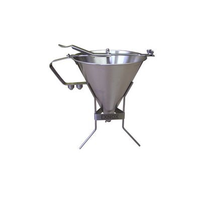 The sauce funnel comes with (3) nozzles: 4, 6 and 8 mm (1/8", 1/4" and 3/8"). Stand is included.