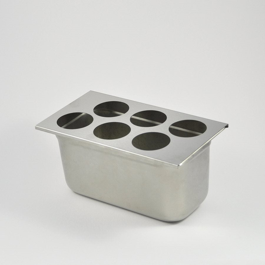 The Fifo 20 Oz Squeeze Bottle Organizer for 1/3 Size Pans, a practical solution for condiment storage. Designed to hold six 20 oz Fifo bottles in a 1/3 insert pan, this organizer streamlines kitchen efficiency for restaurants or home use.