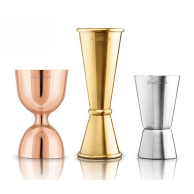 - Includes three jiggers with different finishes: copper, brass, and stainless steel