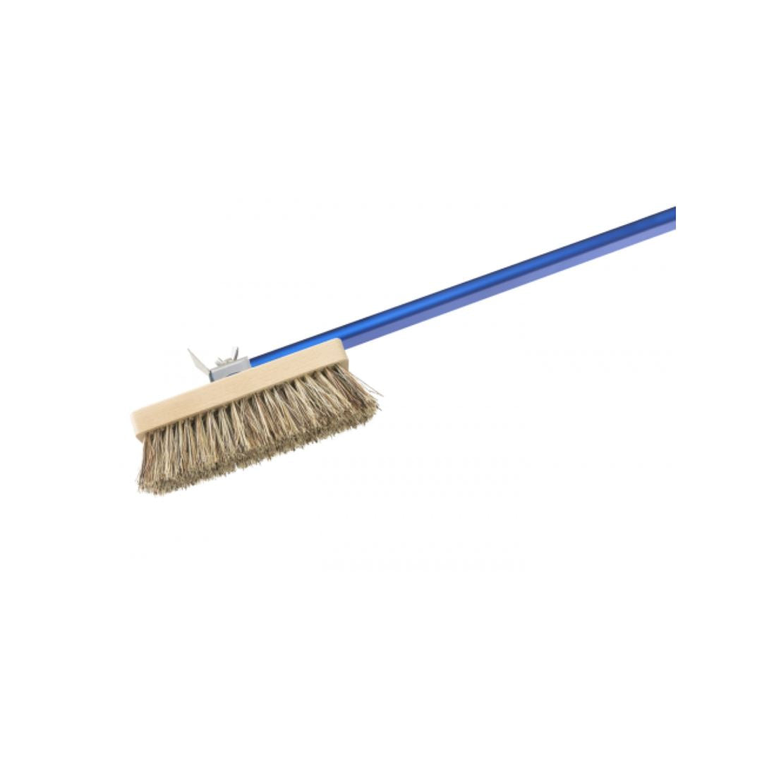 Gi Metal Rotating Head Oven Brush with Natural Bristles, Aluminum, a professional tool for pizzerias. With an 8" x 2.5" swivel head and 59" anodized aluminum handle, this oven brush ensures non-aggressive cleaning of food residues, flour, and ash.