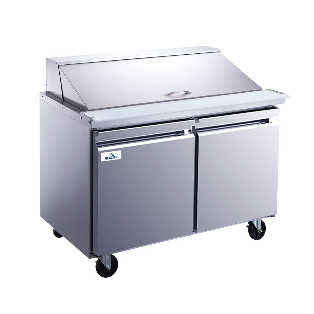 The Glacier GMT-48-18 48" Sandwich / Salad 18 Pan Refrigerated Megatop Prep Table with 2 Door is constructed with durable brushed stainless steel to handle years of use while being easy to maintain. It’s designed with ample space for food storage and preparation and includes one sixth (1/6) pan containers to hold a large assortment of food and toppings.