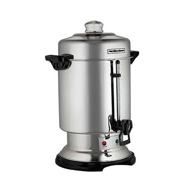 Hamilton Beach Coffee Urns are ideal high-volume coffee dispensers. Sleek and practical, these urns have a gleaming metal finish, comfortable handles, and a locking lid to avoid spill. Hamilton Beach Coffee Urns brew about a cup per minute and an indicator light lets you know when the coffee is ready. The two-way dispenser can fill a single cup or be propped to fill a larger carafe. The lid and brew basket are dishwasher safe, and a detachable cord makes for easy storage.