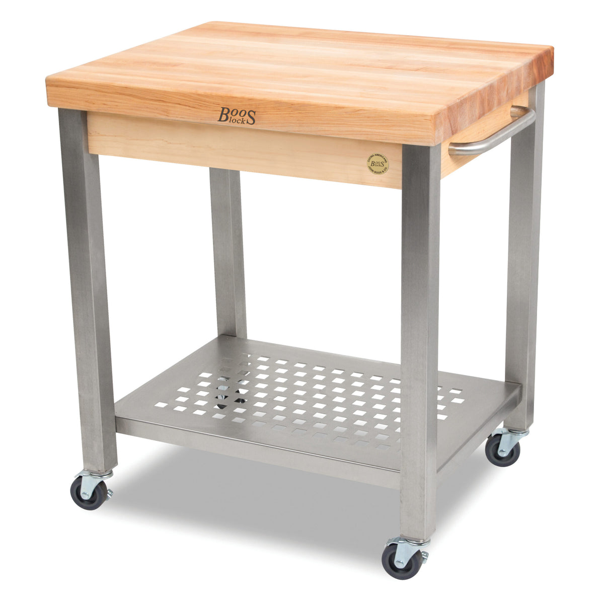The John Boos CUCT04 Cucina Technica 24" x 24" Maple Butcher Block Cart is the perfect blend of commercial-grade quality and contemporary style. Combining a 2.25″ thick edge grain butcher block with a commercial grade stainless steel base. This utility kitchen cart won’t let you down. Strong and durable for the heaviest of tasks and built to last with sturdy locking casters that offer smooth rolling mobility. The commercial grade stainless steel undershelf provides extra storage while the towel bar can be used to hang your kitchen towels or utensils.