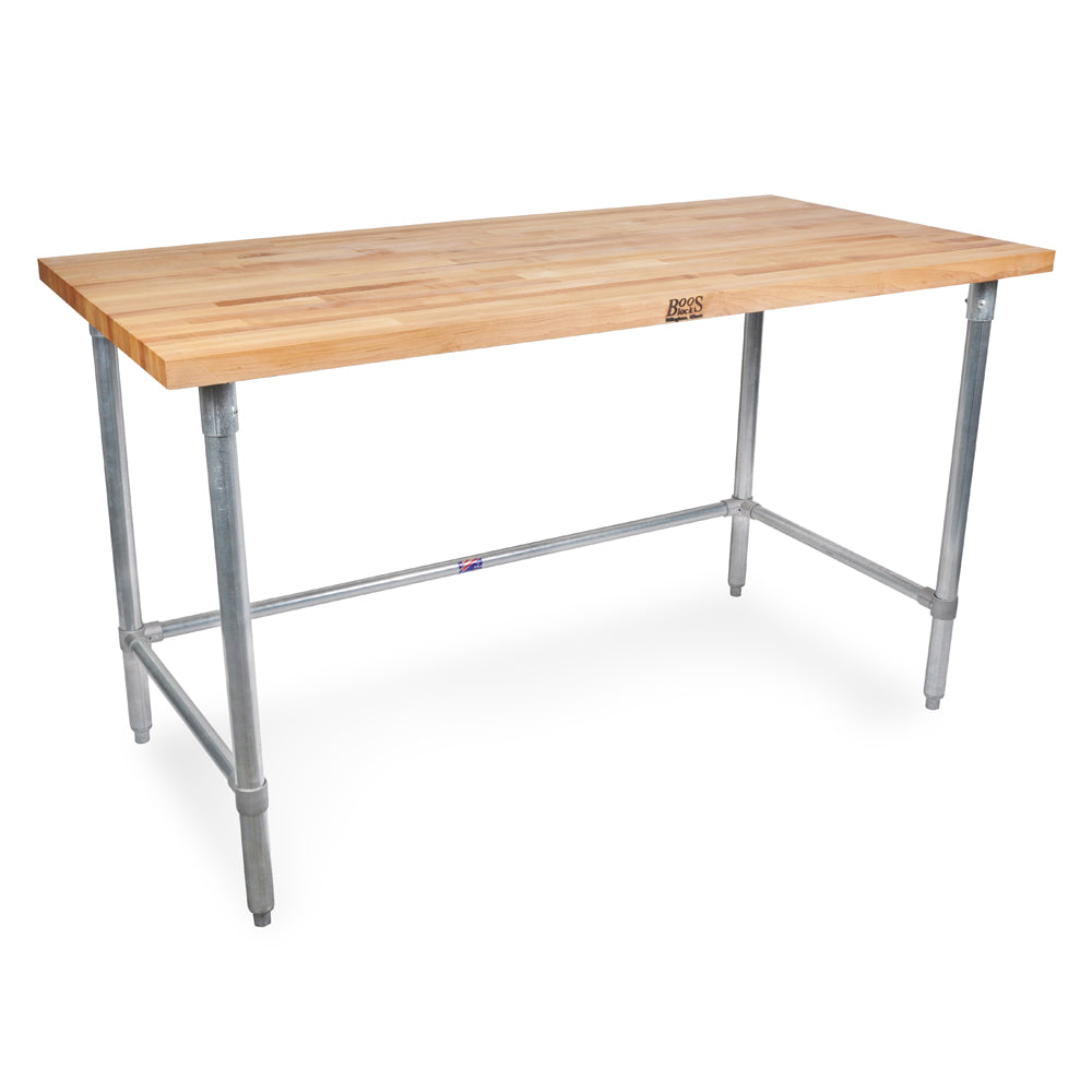 The John Boos JNB03 Wood Top Work Table features a 1.5″ thick Northern Hard Rock Maple top with galvanized legs with adjustable bracings. The wood top comes standard with our oil finish and provides additional counter space to any bakery, garage, commercial business or residential home. The galvanized adjustable bracing provides additional table support while allowing larger equipment, tools, or items to slide underneath the table. NSF & CSA Certified.