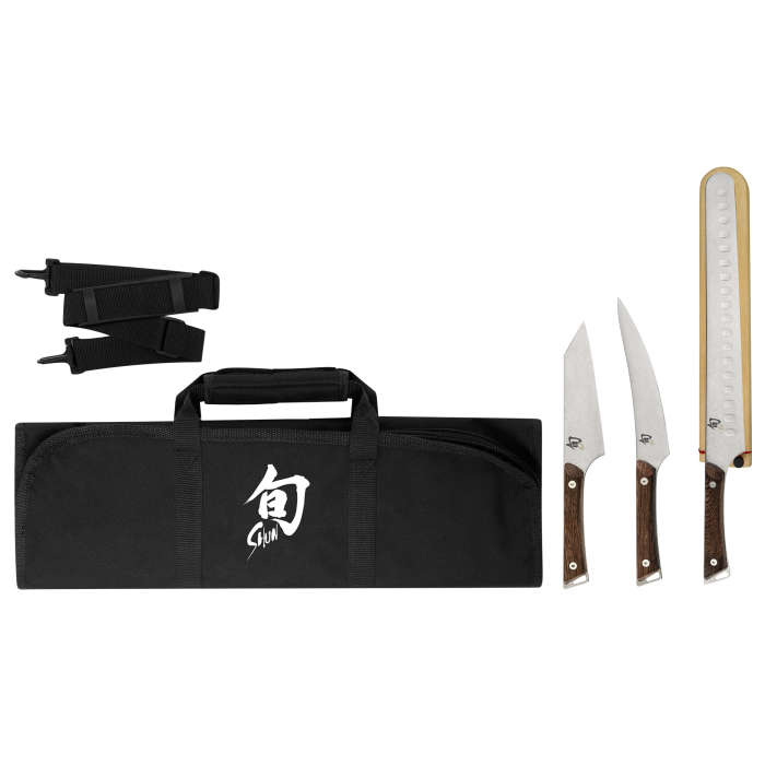 The Shun Four Piece Kanso BBQ Set provides the essential tools for mastering grill-worthy proteins, beautifully packaged in an 8-slot Knife Roll for portability. This thoughtfully designed set is perfect for BBQ enthusiasts, chefs, and outdoor cooking aficionados alike.