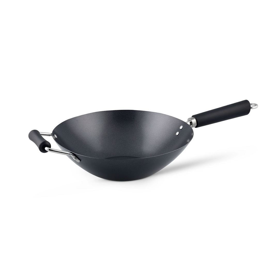 - Lightweight carbon steel wok finished with a three-layer non-stick coating designed for stir-frying at high temperatures and with less oil