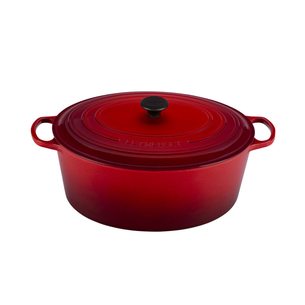 The Le Creuset Cerise 13.9 Litre Goose Pot shares many similarities with traditional Dutch Ovens, offering superior heat retention and durability; however, it differs crucially in its shape. The Goose Pot is ideal for preparing holiday feasts due to its oversized oval shape and large 13.9 L capacity. Equally capable of being used as a serving dish, the Goose Pot makes for a bold addition to any table setting.