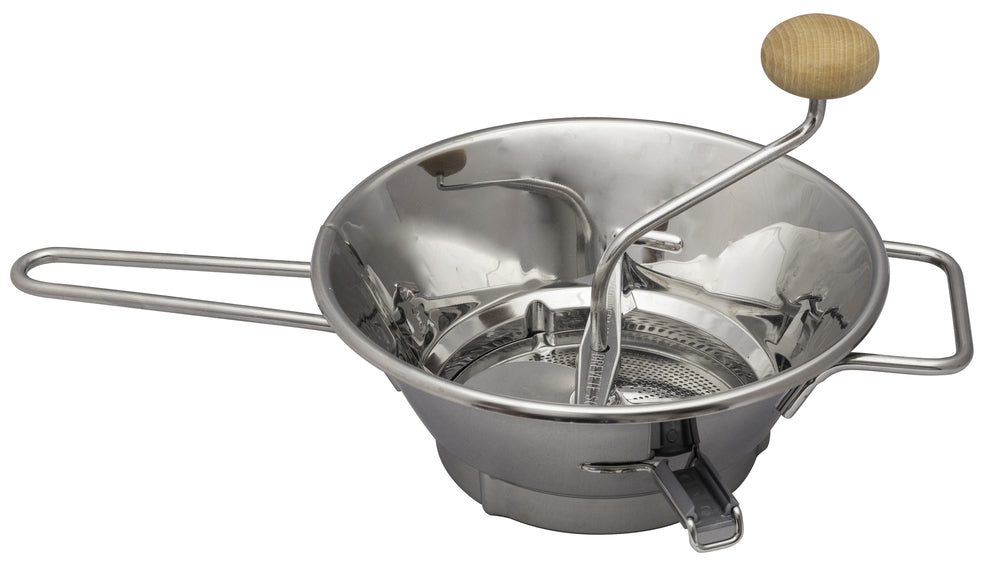 The food mill is made of stainless steel, which ensures durability and easy cleaning. The handle of the food mill is made of varnished beech wood, providing a comfortable grip while using the tool. Additionally, this food mill is dishwasher safe, making it convenient for cleaning after use.