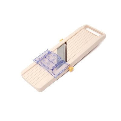 Japanese mandoline with 3 blades (1 mm, 2 mm, 3 mm). Finger guard. Plastic construction with removable stainless steel blade. Made in Japan. 3 month warranty.