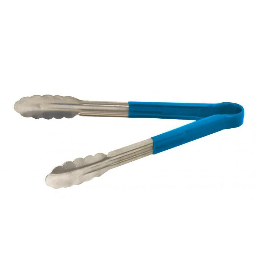 The Nella Heavy-Duty Utility Tongs with blue plastic handles are built for reliable performance in high-volume kitchens. Crafted from durable stainless steel, these tongs feature ergonomic, plastic-coated handles that offer a secure grip, heat resistance, and color-coded safety for food handling.