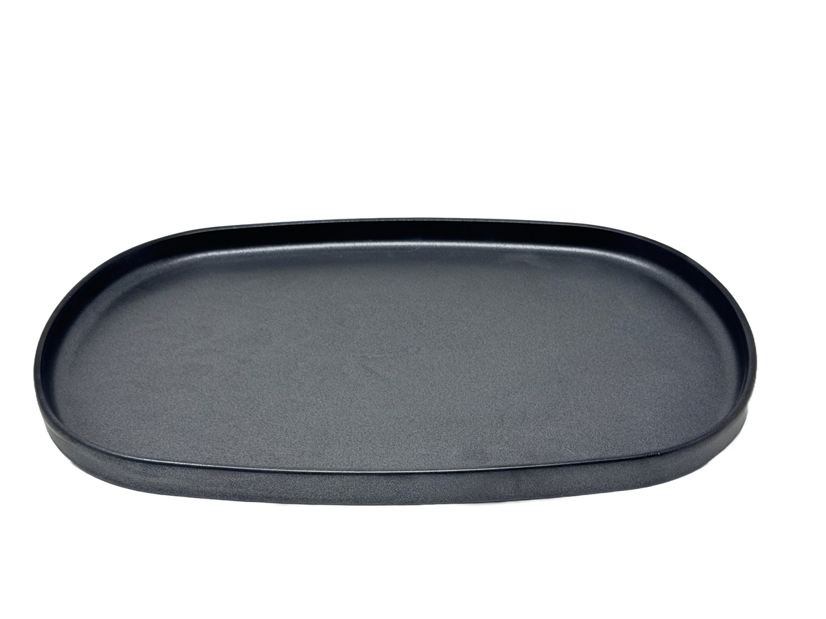Modern Design: Sleek black porcelain with a distinctive 13.25" x 8.5" oval ellipse shape to enhance food presentation.