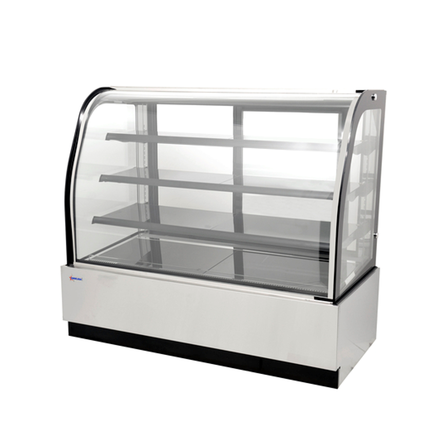 Nella’s Curved Glass Floor Refrigerated Display Case provides an economical solution for displaying your products. Features an exterior tempered glass finish and interior LED lighting, this refrigerated showcase also has an automatic defrost system and fan cooling system. Easy to use and clean. Ideal for deli shops, cafes, and sandwich shops.