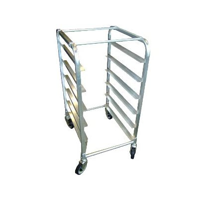 Half size pan rack. Open sides with curved top. 6 welded angle slides, each with 6" spacing. Capacity: 6 18" x 26" pans. Aluminum construction. 5" casters. 26.75” x 21.25” x 45”.