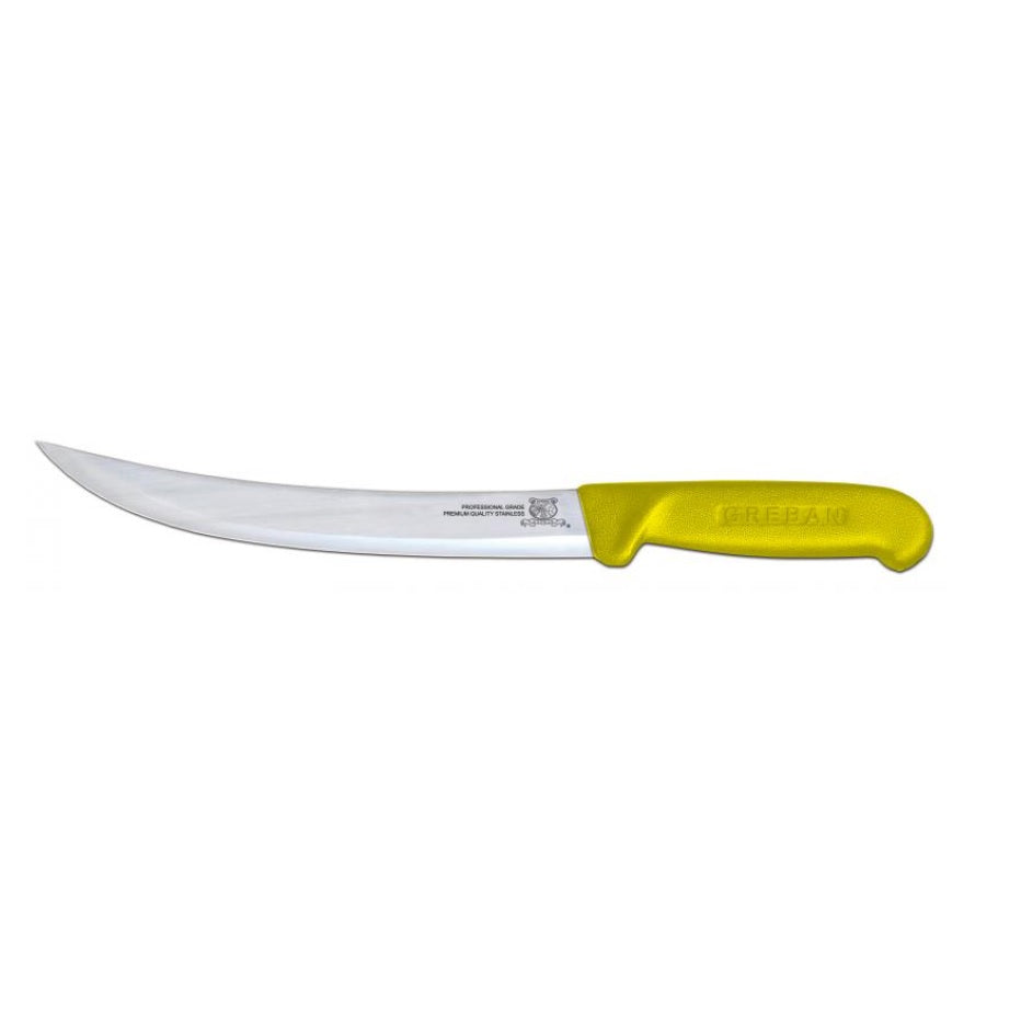 The Nella 8" Breaking Knife with Yellow Handle is an essential tool for butchers and chefs, designed to easily break down large cuts of meat. With its sturdy blade and ergonomic yellow handle, this knife ensures precise control and ease of use during meat preparation tasks.