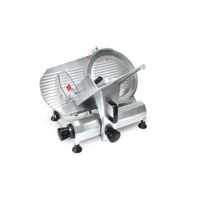 This slicer have anodized aluminum alloy bodies. The high carbon steel blades are hard chromed, with a hollow ground taper for extended sharpening and blade life. This economy belt driven machines offer exceptional cutting consistency and durability. The carriage moves smoothly on ball bearings allowing effortless cutting of deli meats and vegetables. Easy to disassemble for quick cleaning. Perfect for low volume operations. Made in China.
