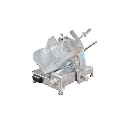 These slicers have anodized aluminum alloy bodies. The high carbon steel blades are hard chromed, with a hollow ground taper for extended sharpening and blade life. These economy belt driven machines offer exceptional cutting consistency and durability. The carriage moves smoothly on ball bearings allowing effortless cutting of deli meats and vegetables. Easy to disassemble for quick cleaning. Perfect for low volume operations. Made in China.