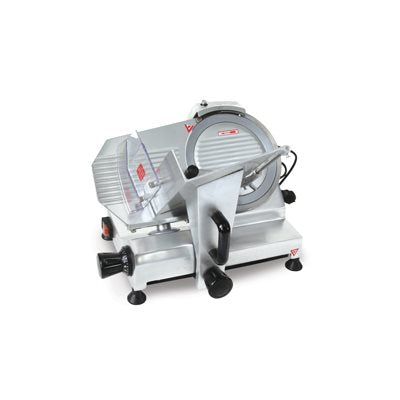 This slicer have anodized aluminum alloy bodies. The high carbon steel blades are hard chromed, with a hollow ground taper for extended sharpening and blade life. This economy belt driven machines offer exceptional cutting consistency and durability. The carriage moves smoothly on ball bearings allowing effortless cutting of deli meats and vegetables. Easy to disassemble for quick cleaning. Perfect for low volume operations. Made in China.