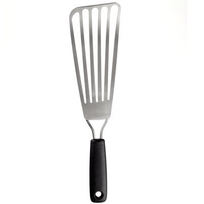Fish Turner, 13.75" / 35cm, stainless steel. Lifts, flips and transfers fish while keeping it intact. Use on whole fish , filets, seafood cakes and more. The beveled edge slides easily beneath foods and the slots in the head allow grease to drain. The durable, stainless steel head i s oversized for larger fish and the soft handle allows for a comfortable grip. Dishwasher safe.