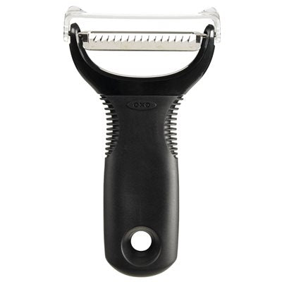 Julienne peeler, 5.5"/14cm, black, stainles s steel.Sharp, stainless steel blades easily create julienne strips. Clear, flip-top safety cover. Contoured handle accommodates all grips. Dishwasher safe.