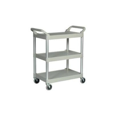 The Rubbermaid Three Tier Utility Cart is a durable, multi-purpose solution for tasks in restaurants, offices, or warehouses. Its 200-pound capacity and elegant platinum grey finish with brushed aluminum uprights make it ideal for transporting supplies or equipment with a modern, professional aesthetic.