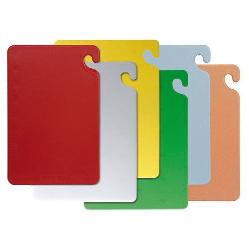 Upgrade your kitchen's food safety and efficiency with the San Jamar Cut-N-Carry® Cutting Board Set. Designed for commercial kitchens and serious home chefs, this 6-piece set features HACCP-compliant color-coded boards to help prevent cross-contamination between food types. Each board is equipped with San Jamar’s patented Food Safety Hook, which promotes sanitary storage, hands-free transport, and hygienic drying.