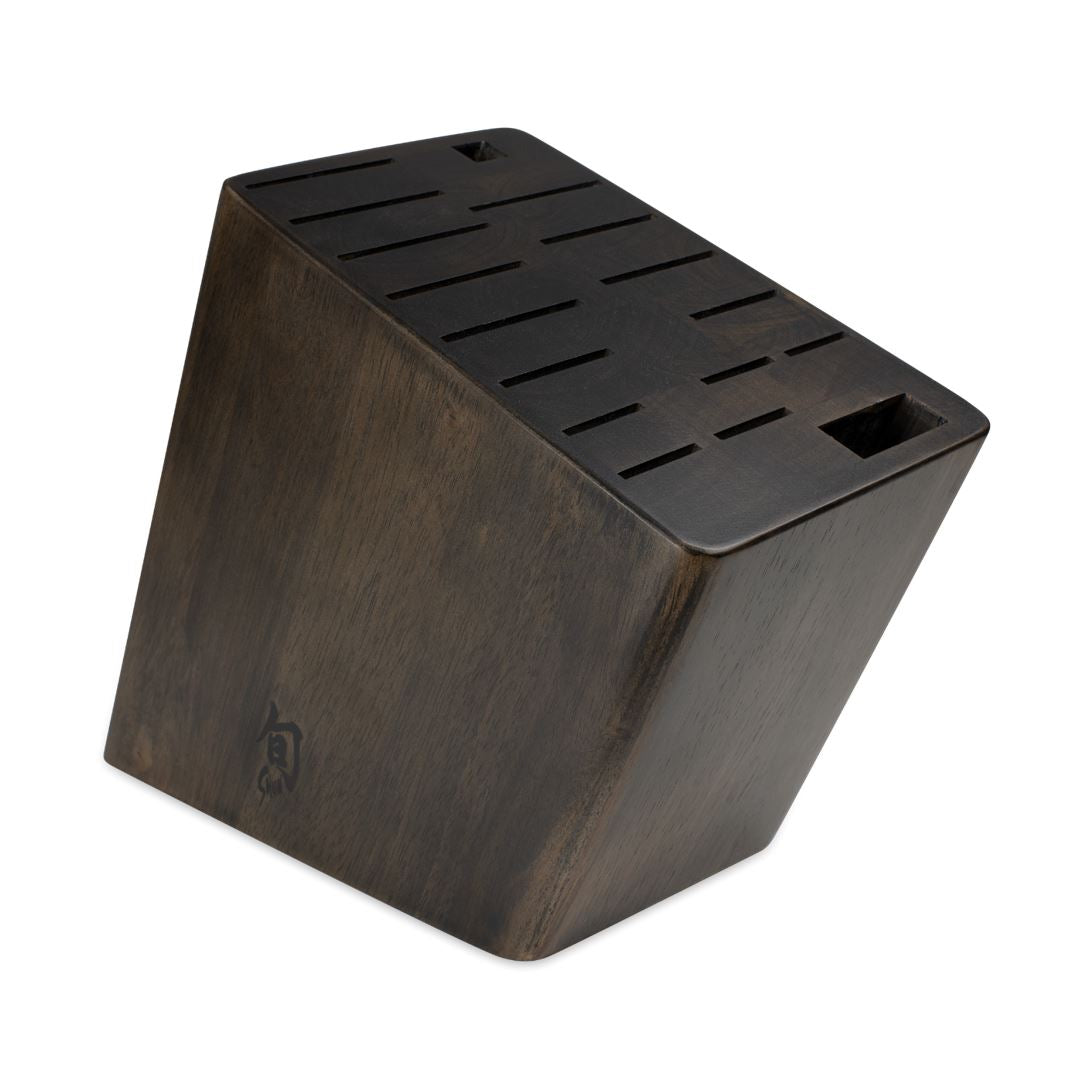 The Shun Kanso 17-Slot Block offers ample room for your growing Kanso collection. Crafted from solid wood and finished to match Kanso’s tagayasan (or wenge) handle, it complements other Shun styles beautifully. This elegant block features 17 slots, including one for honing steel and one for kitchen shears, providing versatile and organized storage.