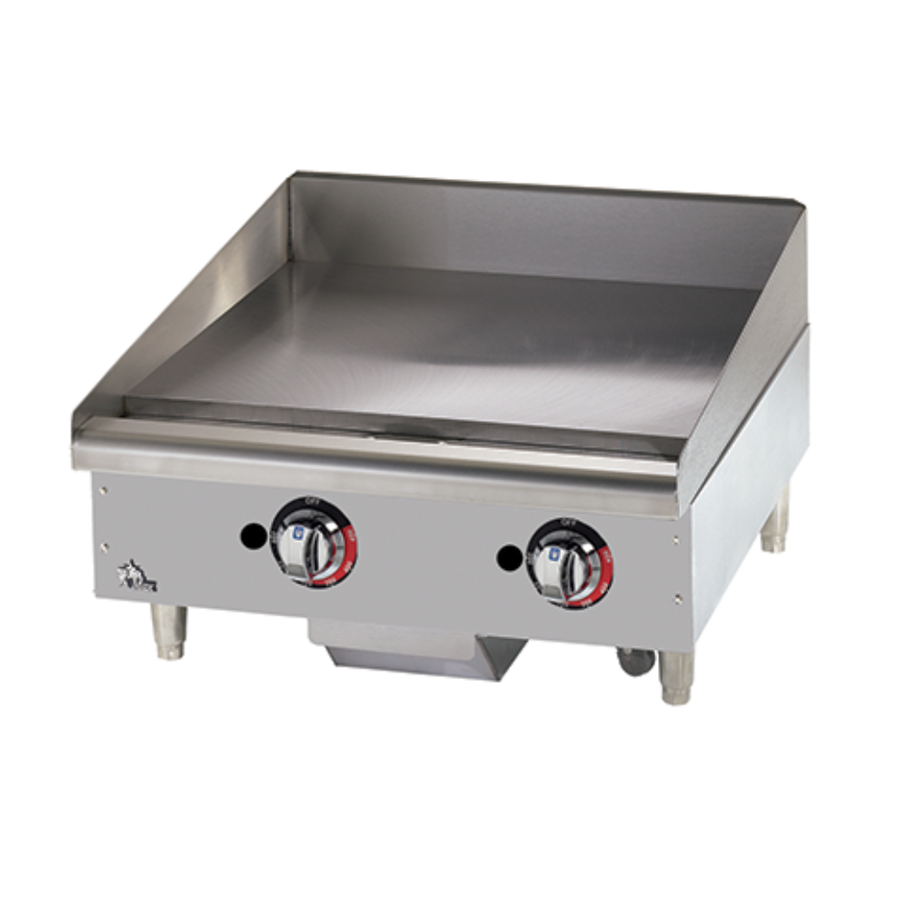 Star-Max® gas griddles are a perfect match for the budget minded operator. For breakfast, lunch or dinner, the Star-Max griddles out-perform the competition. Star-Max® griddles feature a 1” thick polished steel griddle plate. 28,300 BTU aluminized burner every 12” of width controlled by a embedded modulating thermostatic, 3/4” N.P.T. male gas connection with convertible pressure regulator, and 4” adjustable legs. Griddles operate on Natural gas.