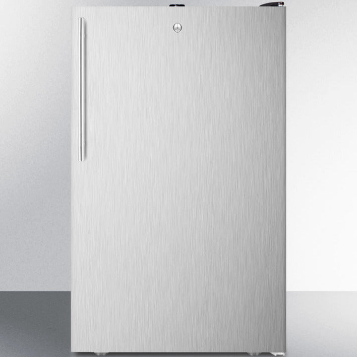 The Summit 20" Undercounter Refrigerator with 1 Solid Door, Residential* is a compact yet high-performing 20" wide counter-height refrigerator designed for freestanding use. With a sleek stainless steel wrapped door, factory-installed lock, and adjustable storage options, it’s an excellent choice for small kitchens, offices, break rooms, and general-purpose storage.