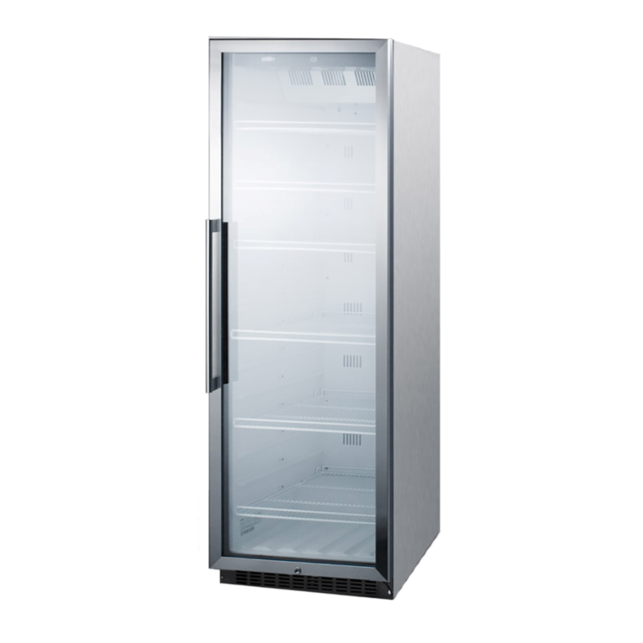 Commercial beverage merchandiser with 12.6 cu.ft. capacity, digital thermostat, self-closing door, and stainless steel cabinet; replaces SCR1400CSS